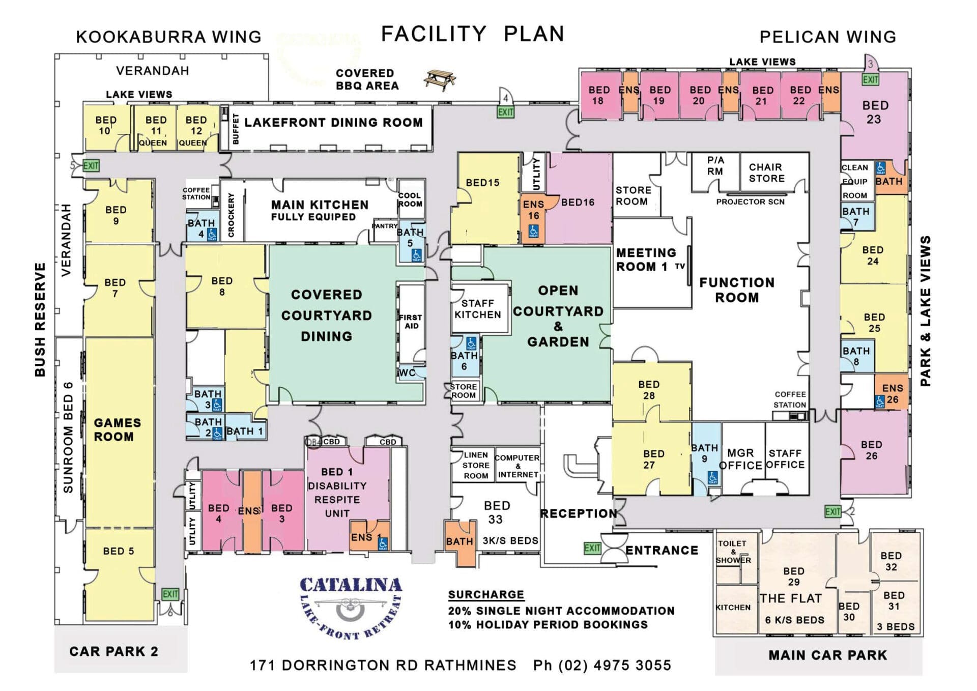 Facilities include a café-style dining area overlooking the BBQ entertaining area facing the lake, and the alternative of a covered all-weather courtyard if you prefer to dine alfresco. Catalina has a well-equipped commercial kitchen with facilities for large group catering.